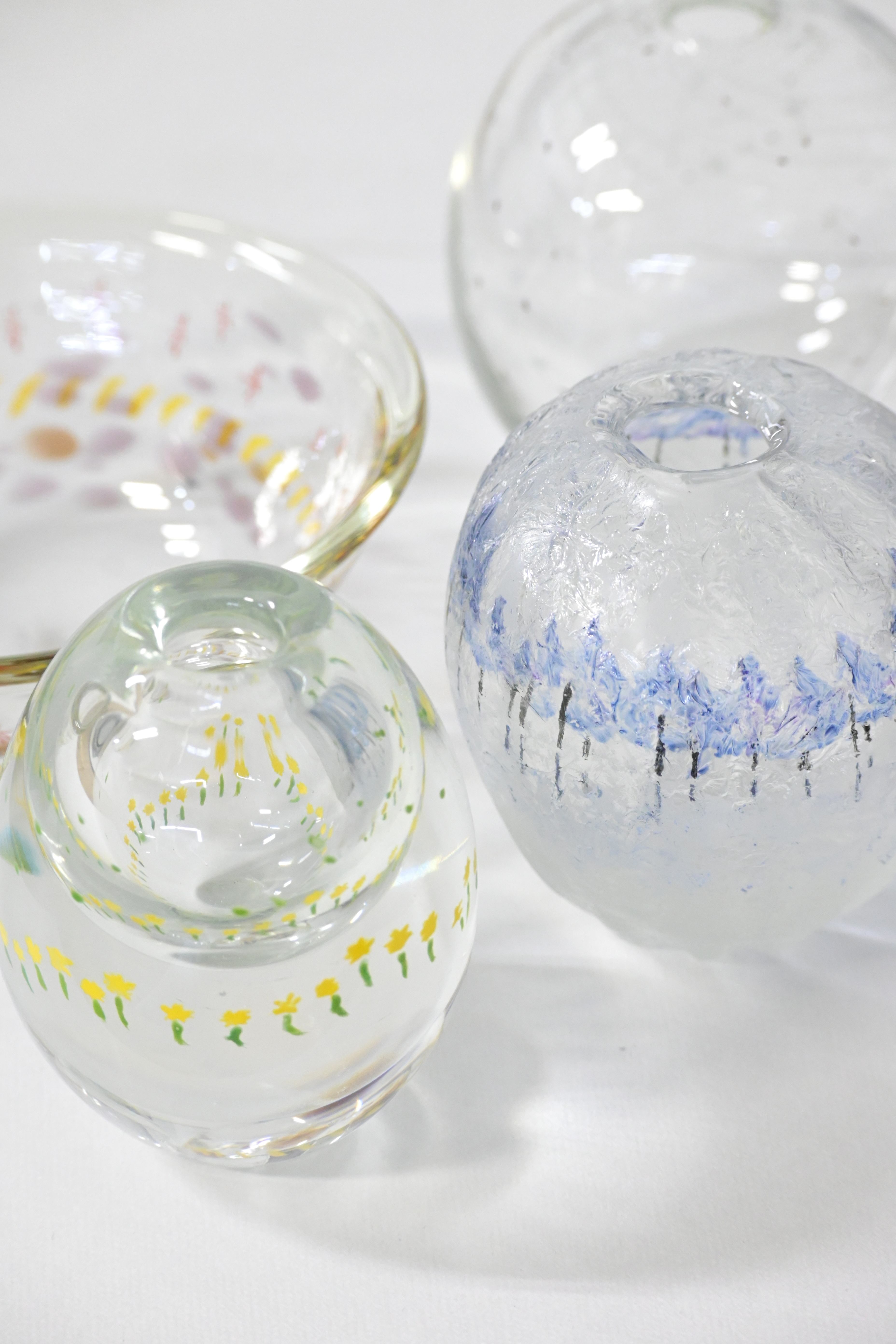 吹きガラス、カット、とんぼ玉、酸素バーナー、サンドブラスト、パートドヴェール、板ガラス造形、グラヴィールに続く9種目のガラス技法として、「エナメル絵付け」を学びました。エナメル絵付けとは、ガラスの表面に「エナメル」という ... 学生による「エナメル絵付け」作品をご紹介 令和7年度