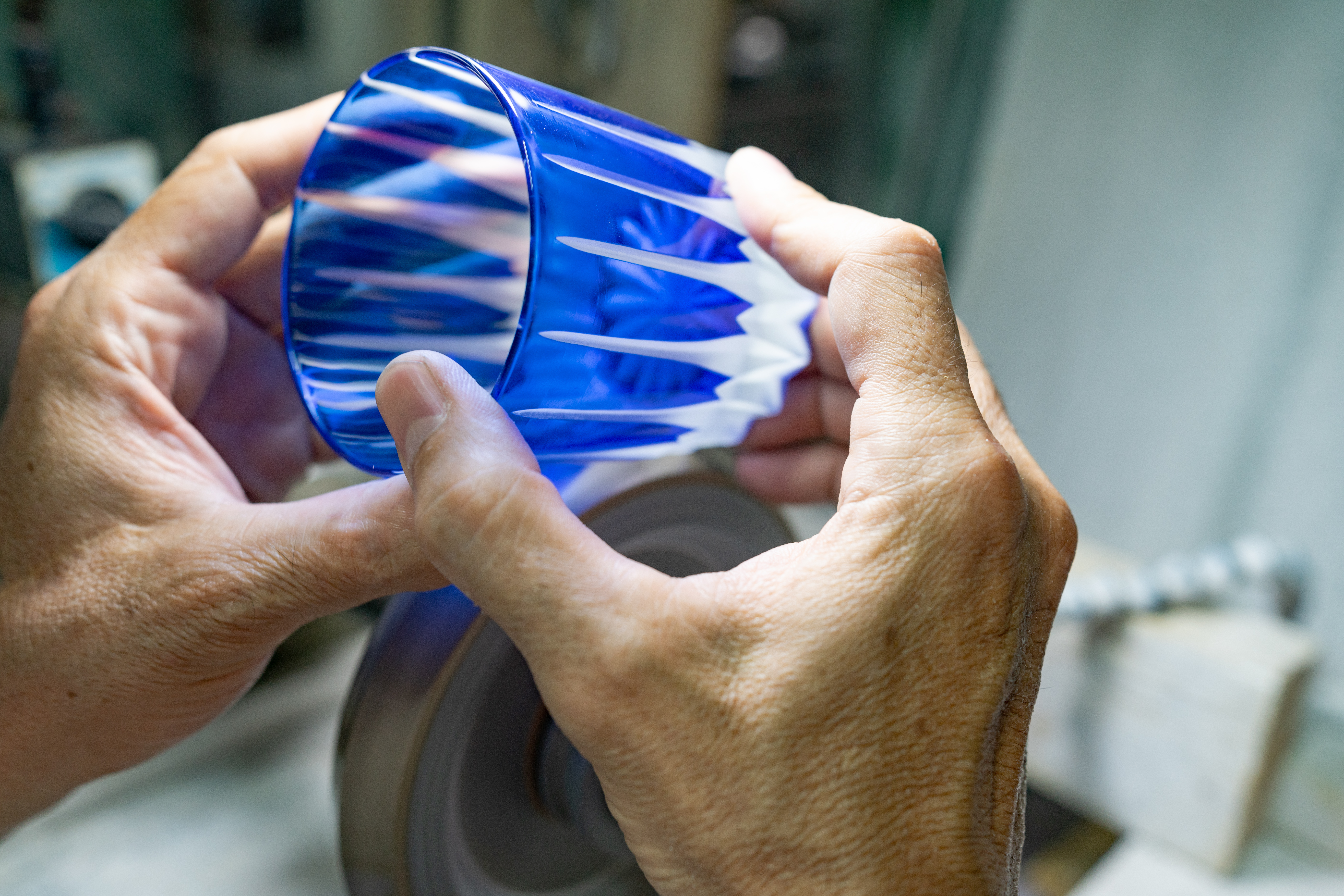 彫刻する前のプレーンなガラスの器を、「ガラス生地」と呼んだりします。この「生地」を用意するところから作品制作は始まります。