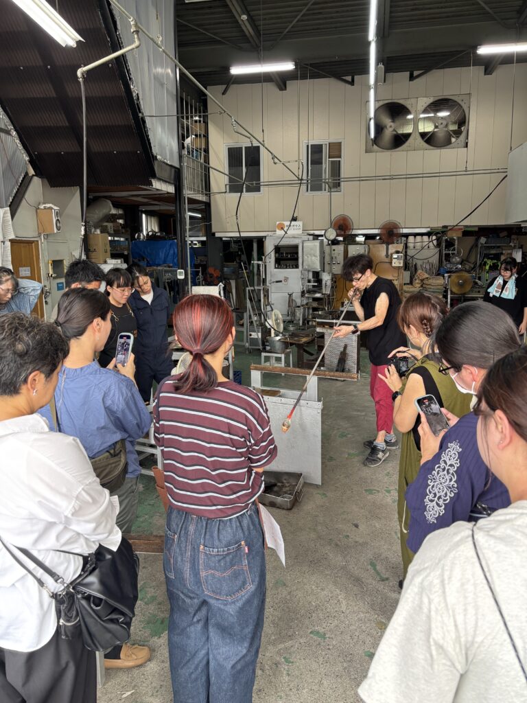 吹き場(吹きガラスするところ)を通った際、総合基礎科の授業の最中でした!ちょうど先生のデモンストレーション中だったので、見学しました。