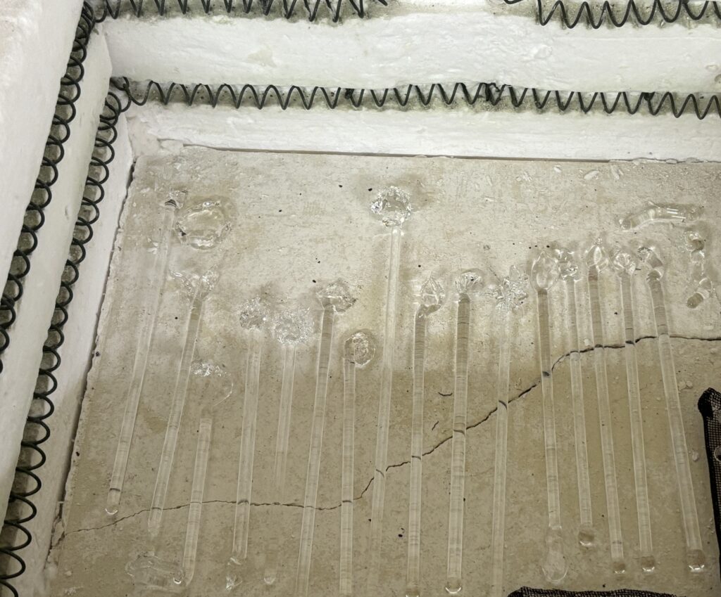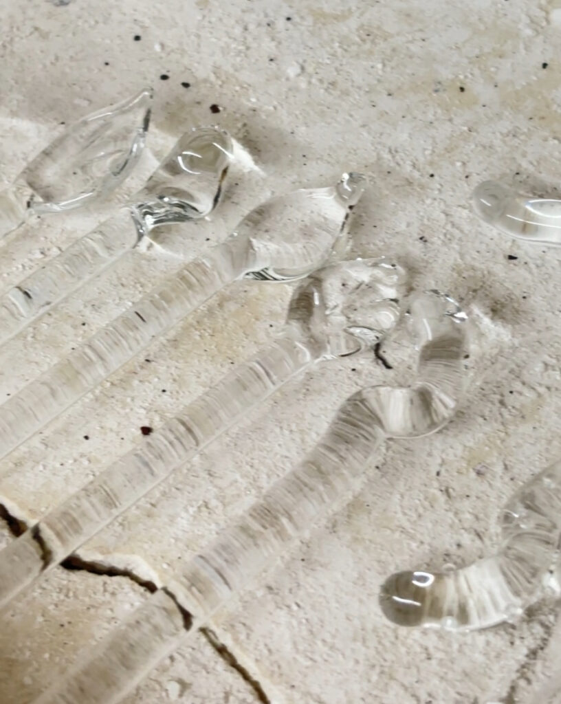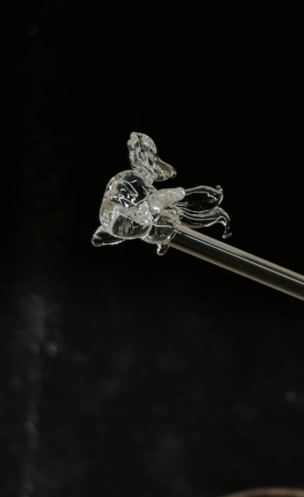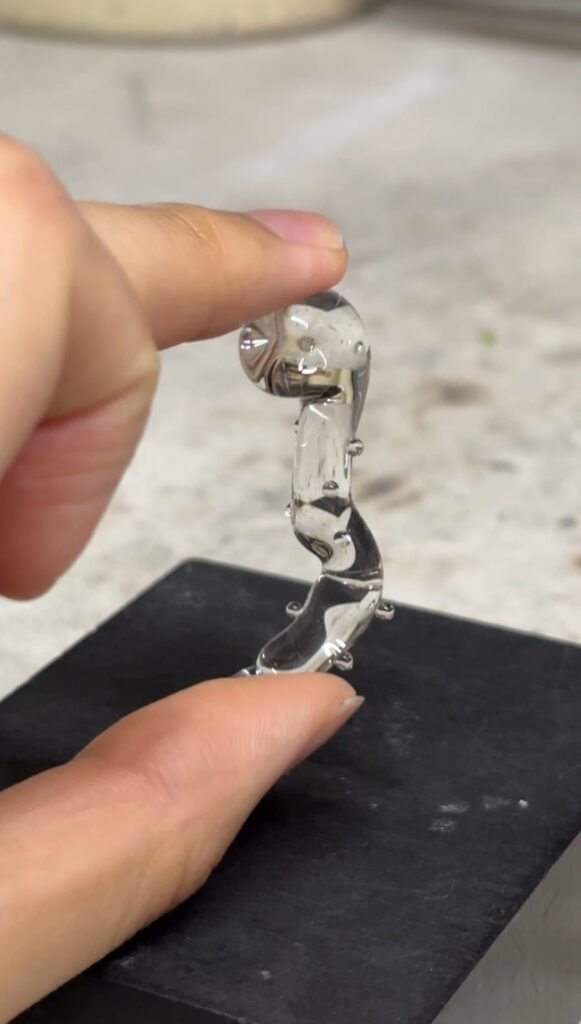 熱すると、柔らかい粘土もしくは暑い日のキャラメルくらいの柔らかさになります。そのタイミングで、道具でつまんだり引っ張ったりすることで形を変えるのです。炎の外に出すと数秒以内にカチカチに戻るのでスピード勝負!