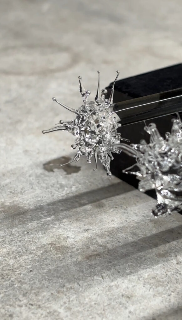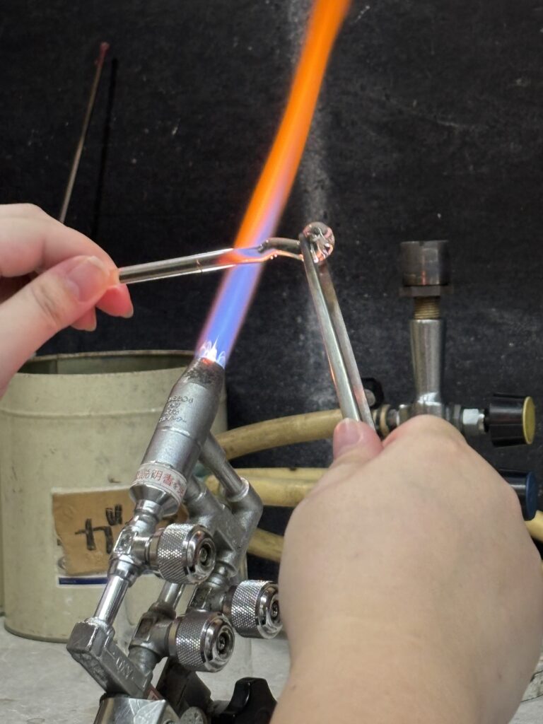 吹きガラスとは違い、実験器具に使われるような耐熱ガラスを高温のバーナーで溶かして伸ばしたりつぶしたりすることで作品化します。