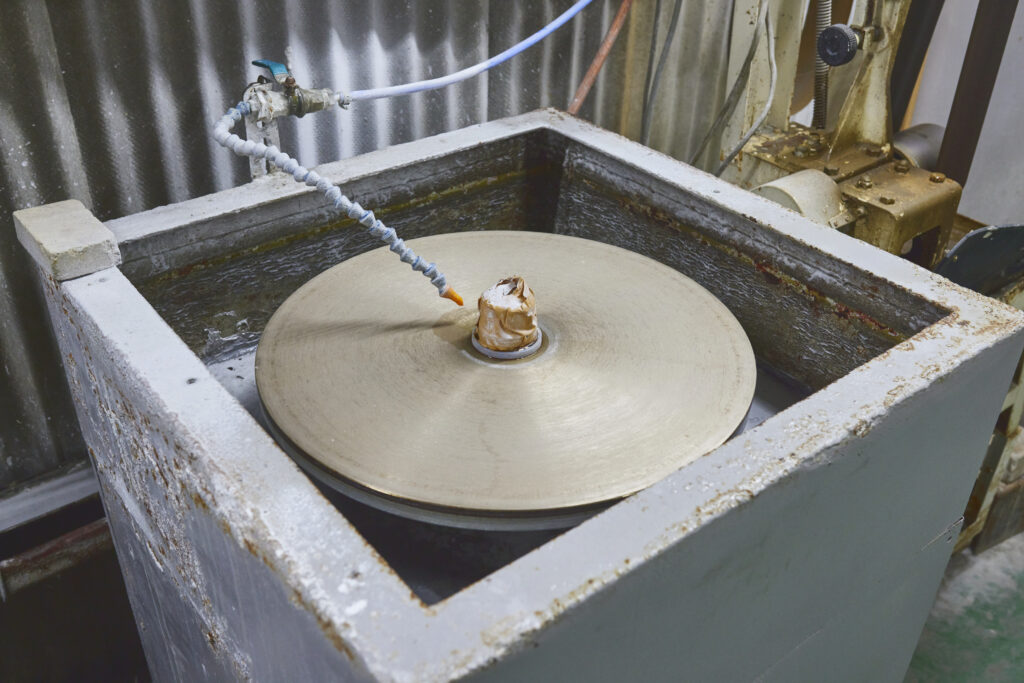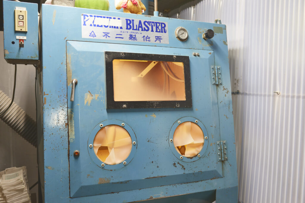 ▲砂を強く吹き付けてガラスを削る機械。丸い穴から手を入れる。