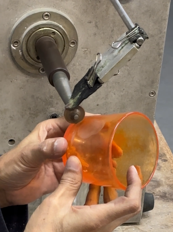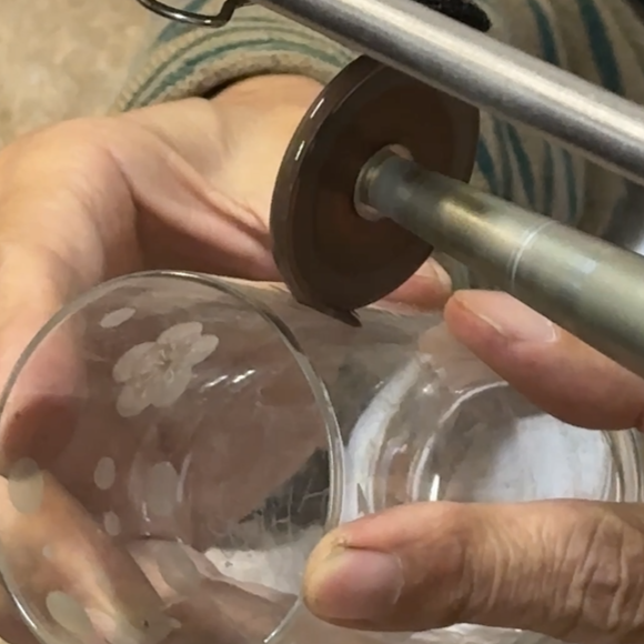 ・切子では刃の上からガラスを当て、グラヴィールでは刃の下からガラスを当てる。