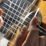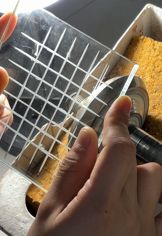 授業のはじめは機械の使い方や研磨剤の作り方、ガラスを当てる姿勢などの基礎を学び、直径1㎝程度の丸をきれいに彫る練習を進めます。それを経てある程度彫り方が身についてきたら、自由作品を一点制作し、「デザイン→彫り→磨き」の工程を学びます。授業最終日には講評会を行い、先生から評価を受けたり、他の学生と意見交換をしたりします。
