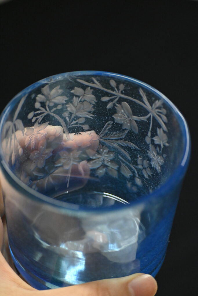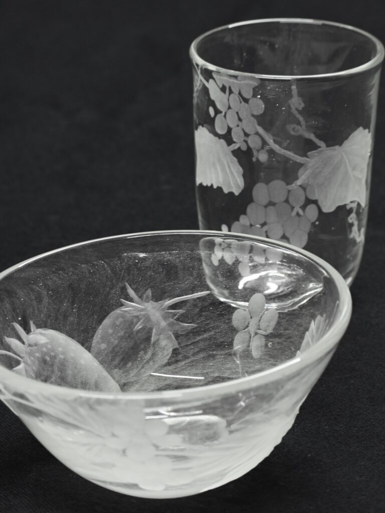 ・切子は幾何学模様を彫るのが主で、グラヴィールは動植物などの有機的なものを彫るのが主。