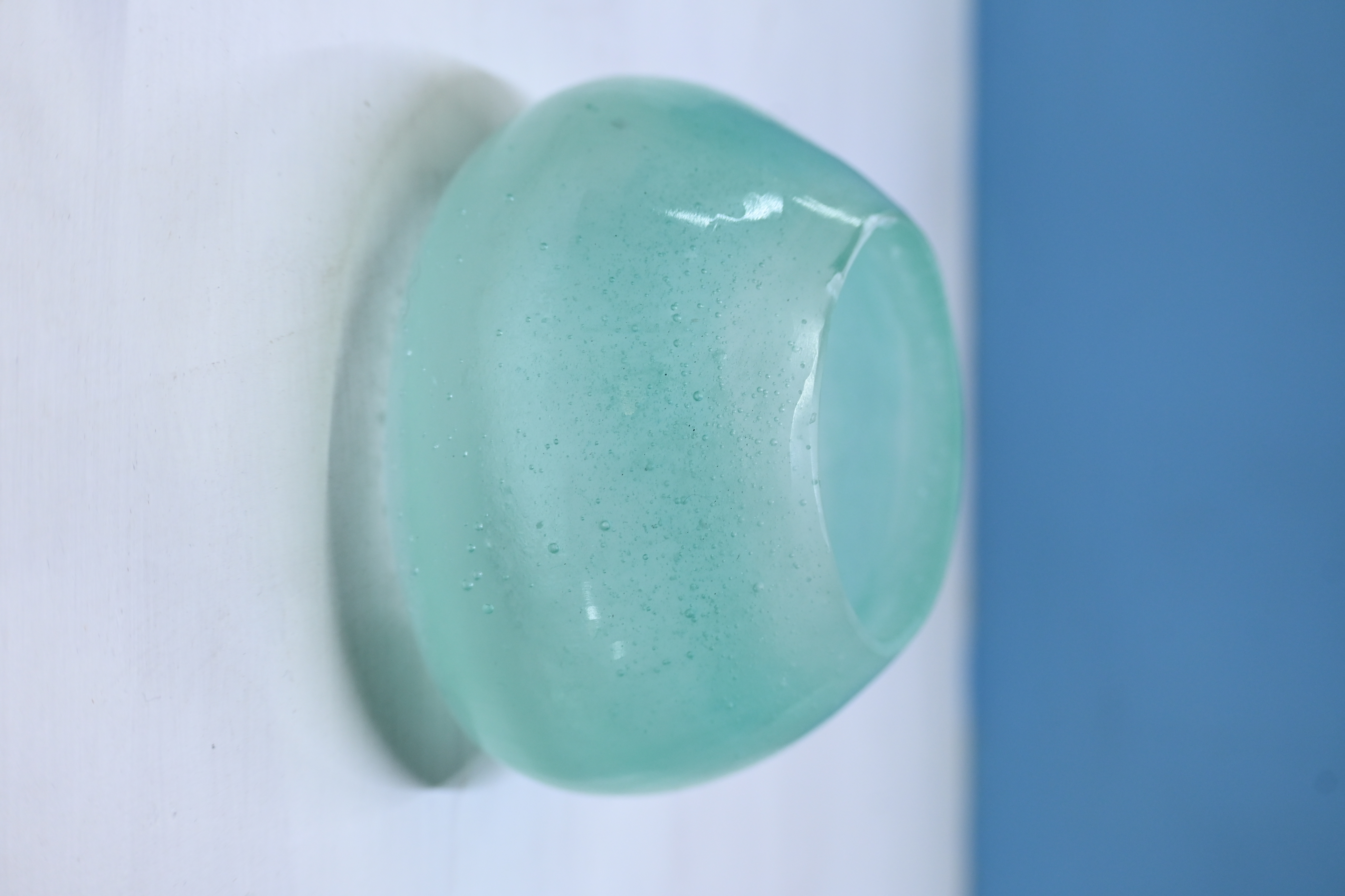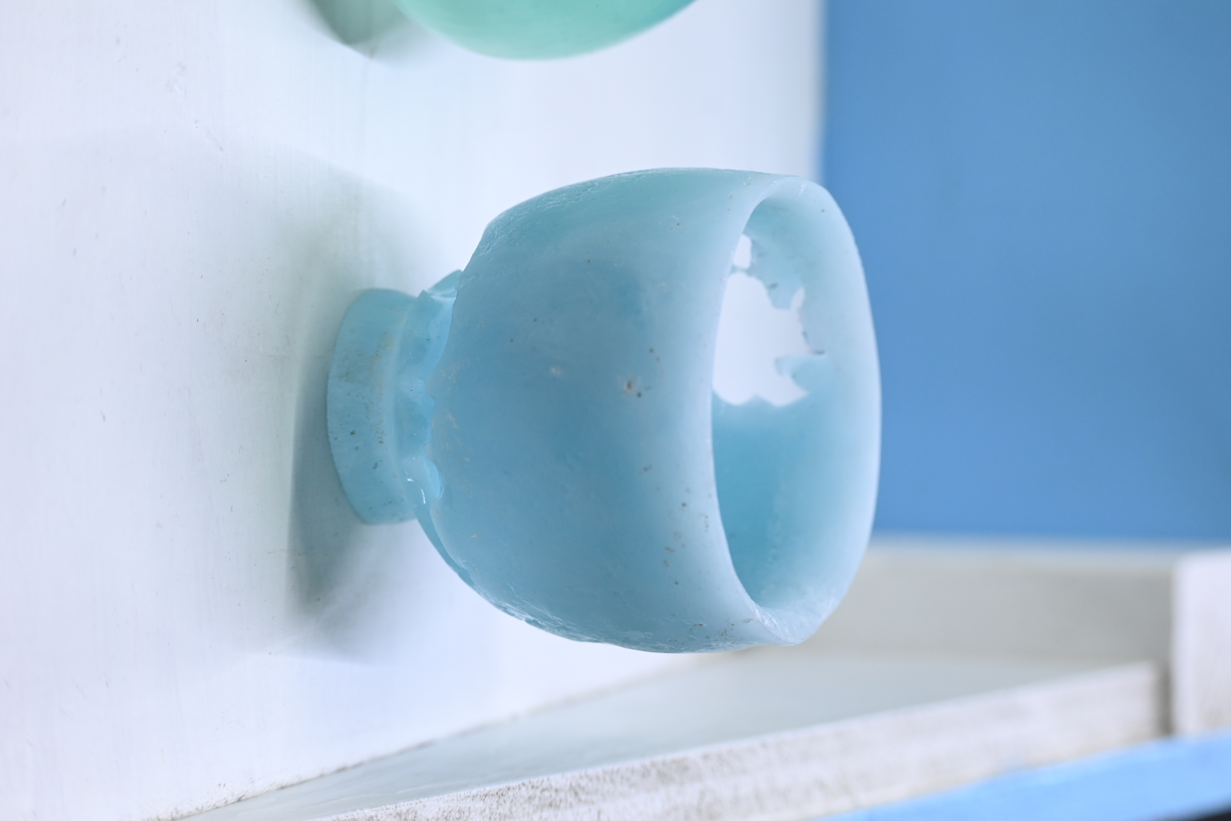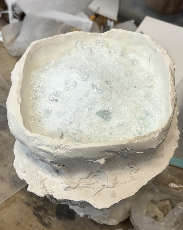 凹凸があるため、割り型という応用的な型で作成しました。型取りや焼成でいくつもの壁に当たりましたが、なんとかガラスになってよかったです。