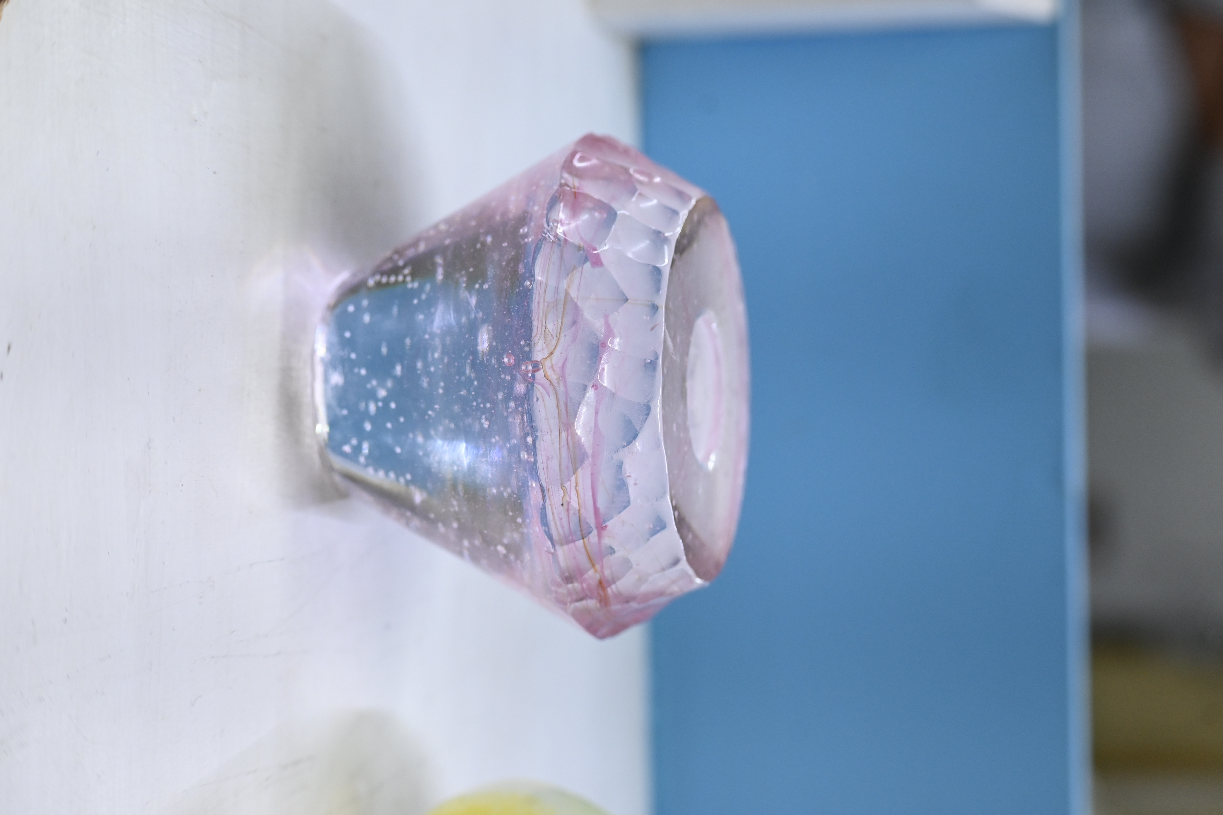 本物のますを型取りした石膏型で作りました。磨きもしっかり鏡面まで行いました。吹きガラスも、半年前は未経験だったと思えないほどしっかり形を作れています。自分で作ったガラスで飲む気分は格別ですね!