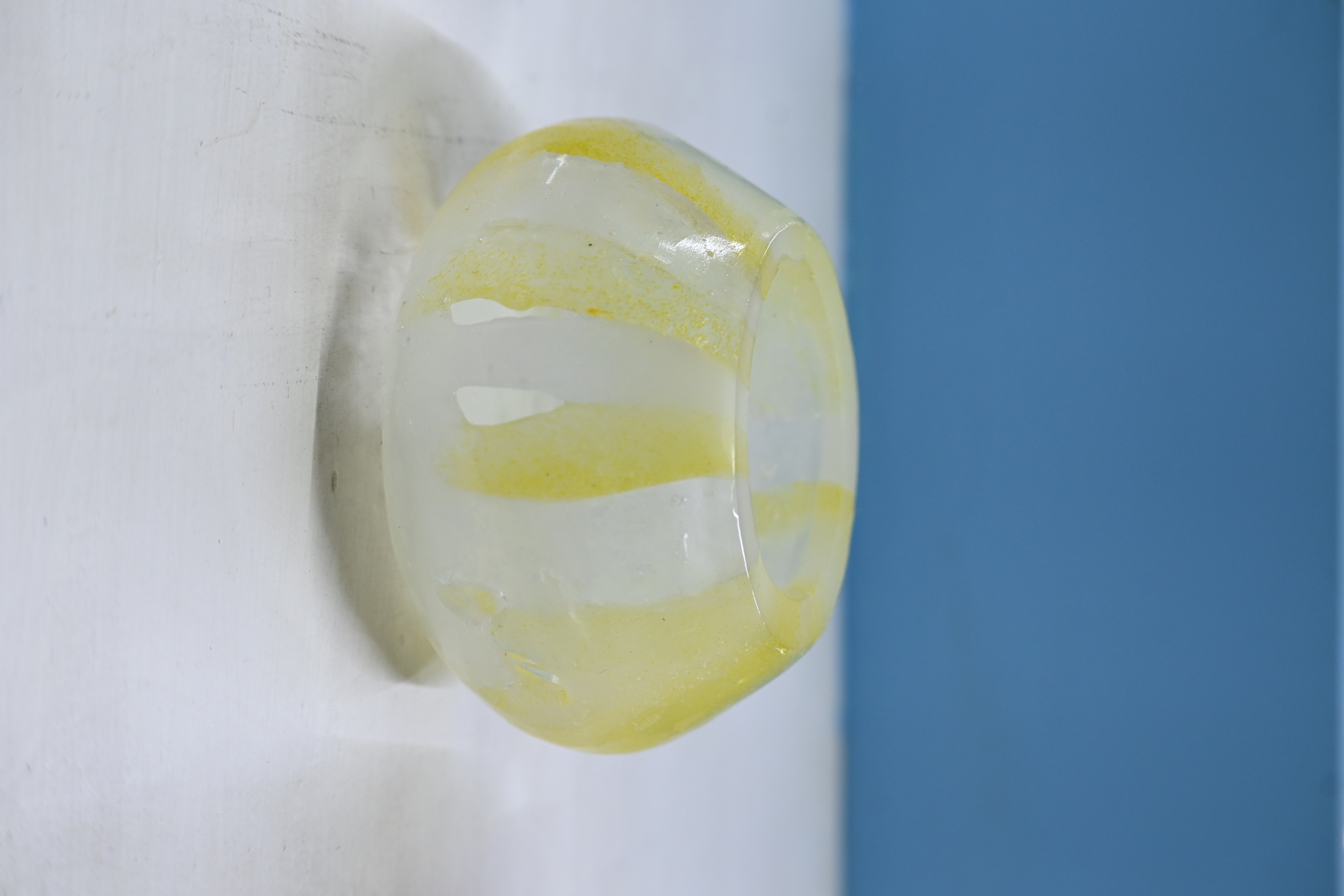 ぐい吞みとして作ったものの、飲み口部分のガラスに少々空気が入ってしまったことにより凹凸が激しく、飲むには難しい状態。そこで、アクセサリー入れやライトとして作品化することを考えたそう。よってタイトルは「UP TO ME(自分次第)」。大西先生からも、「ピンチはチャンス。ガラスづくりで失敗はよく起こるもの。どうカバーしたらいい作品になるかを常日頃から(先生も)考えている。」そんなコメントを頂きました。