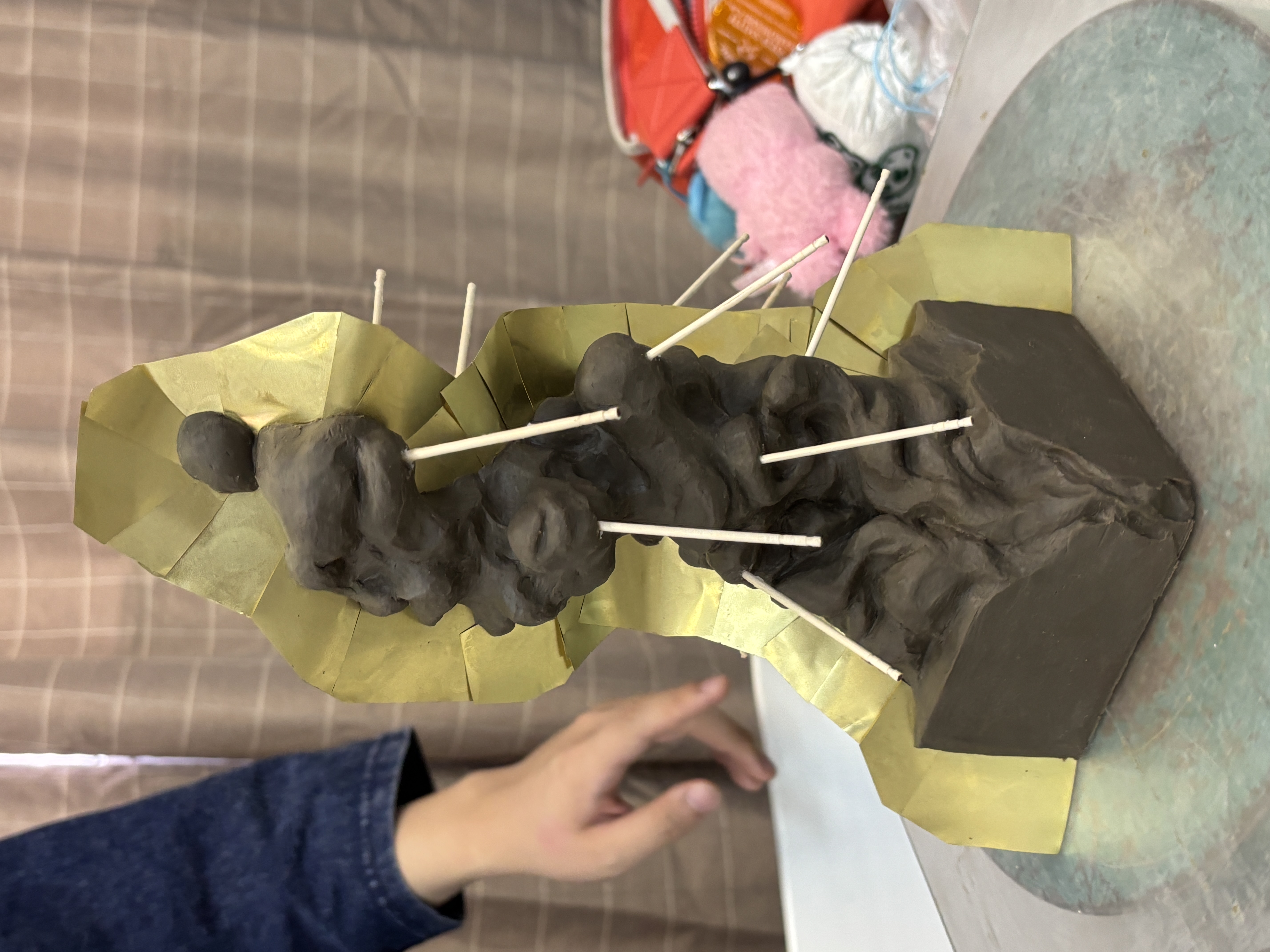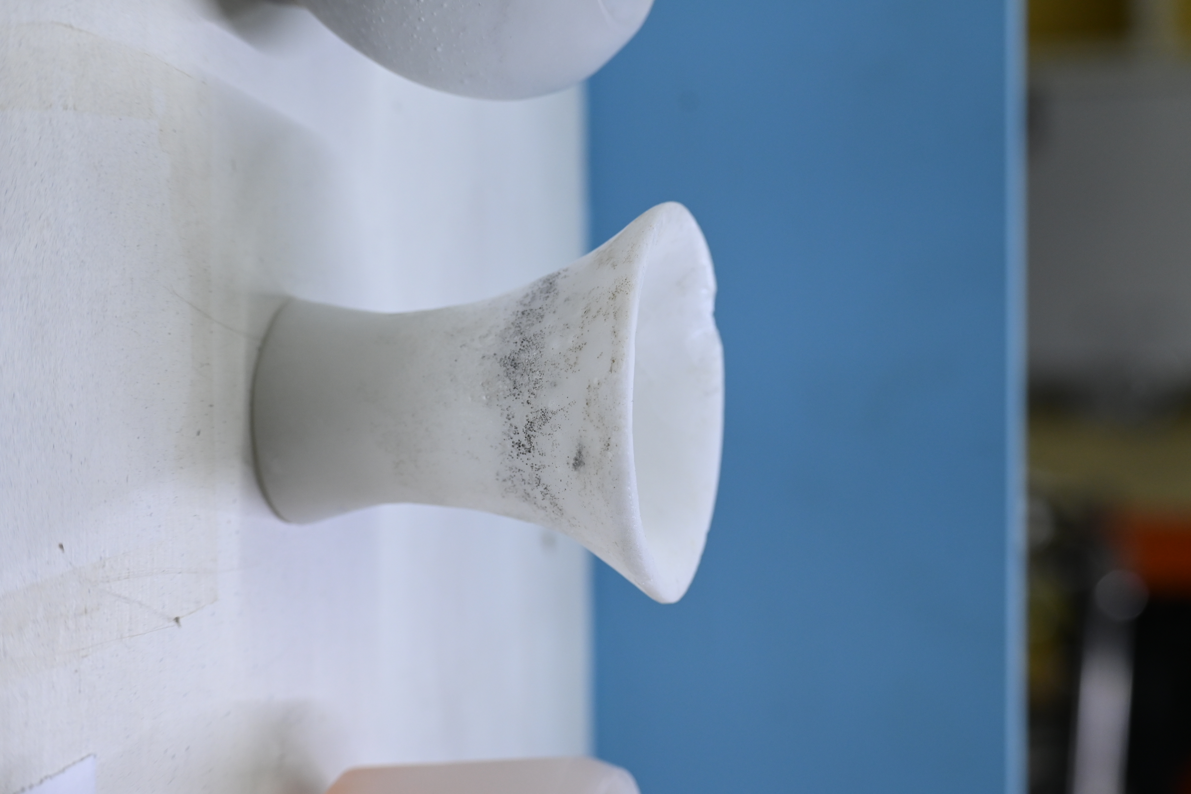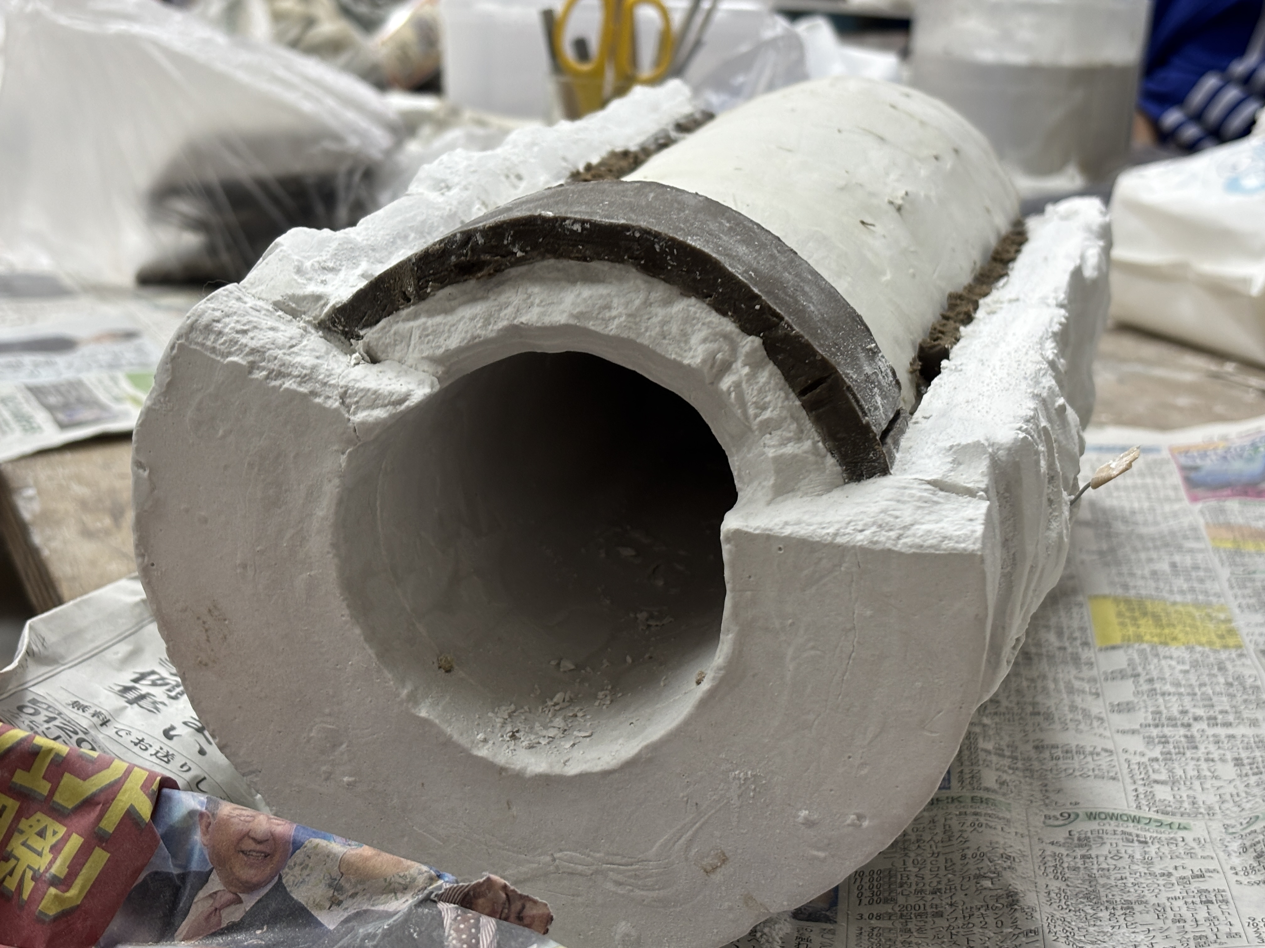 ▼型作りではとても苦労しました!(茶色い円柱…水粘土、白いペースト…石膏)