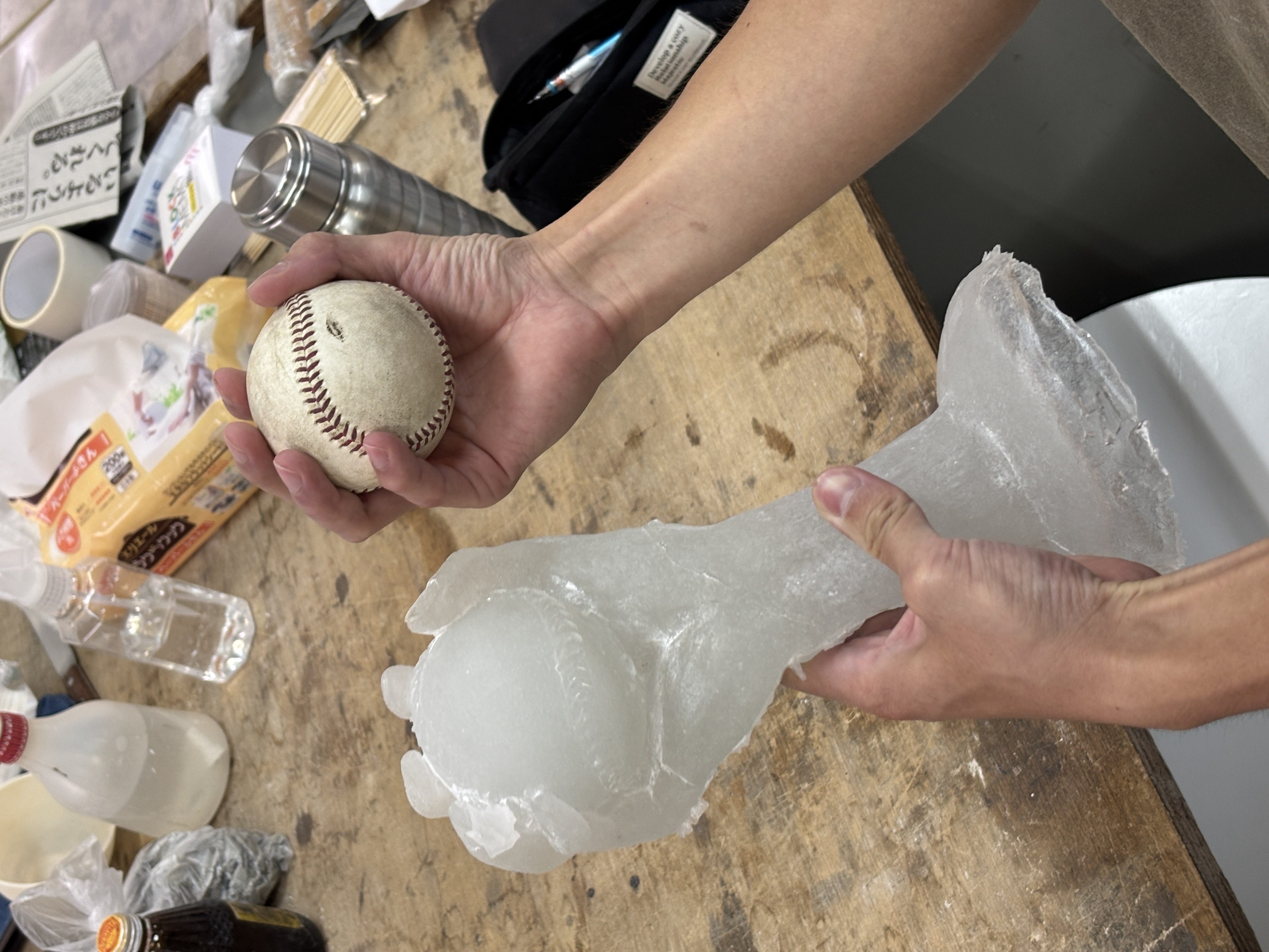 ▼高校最後の野球で負け、悔しくてボールを握っているオブジェ。