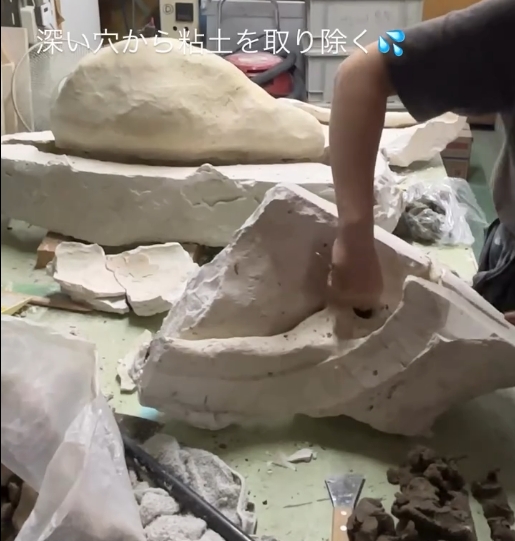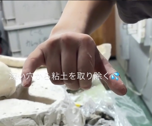 問題となるのは、粘土が取れる出入口である手首が細く、道具を入れようとしても、指先の方にはなかなか届かないということ。きれいにすべての粘土を取り除くことはとても難しいです。そこで、「石膏を割る」という手法を使います。