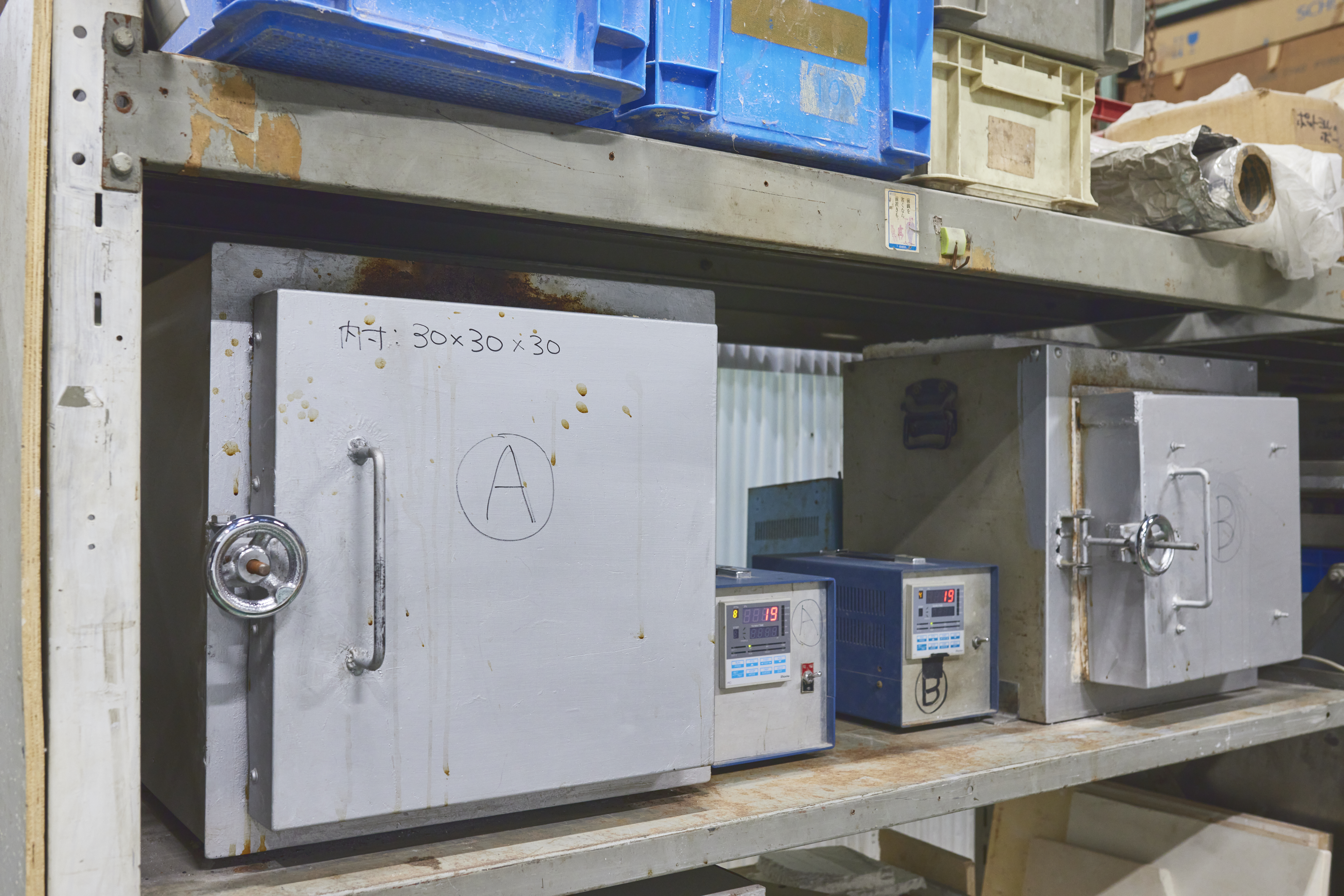 ▼電気炉の中に、ガラスが詰まった石膏型が置かれています。