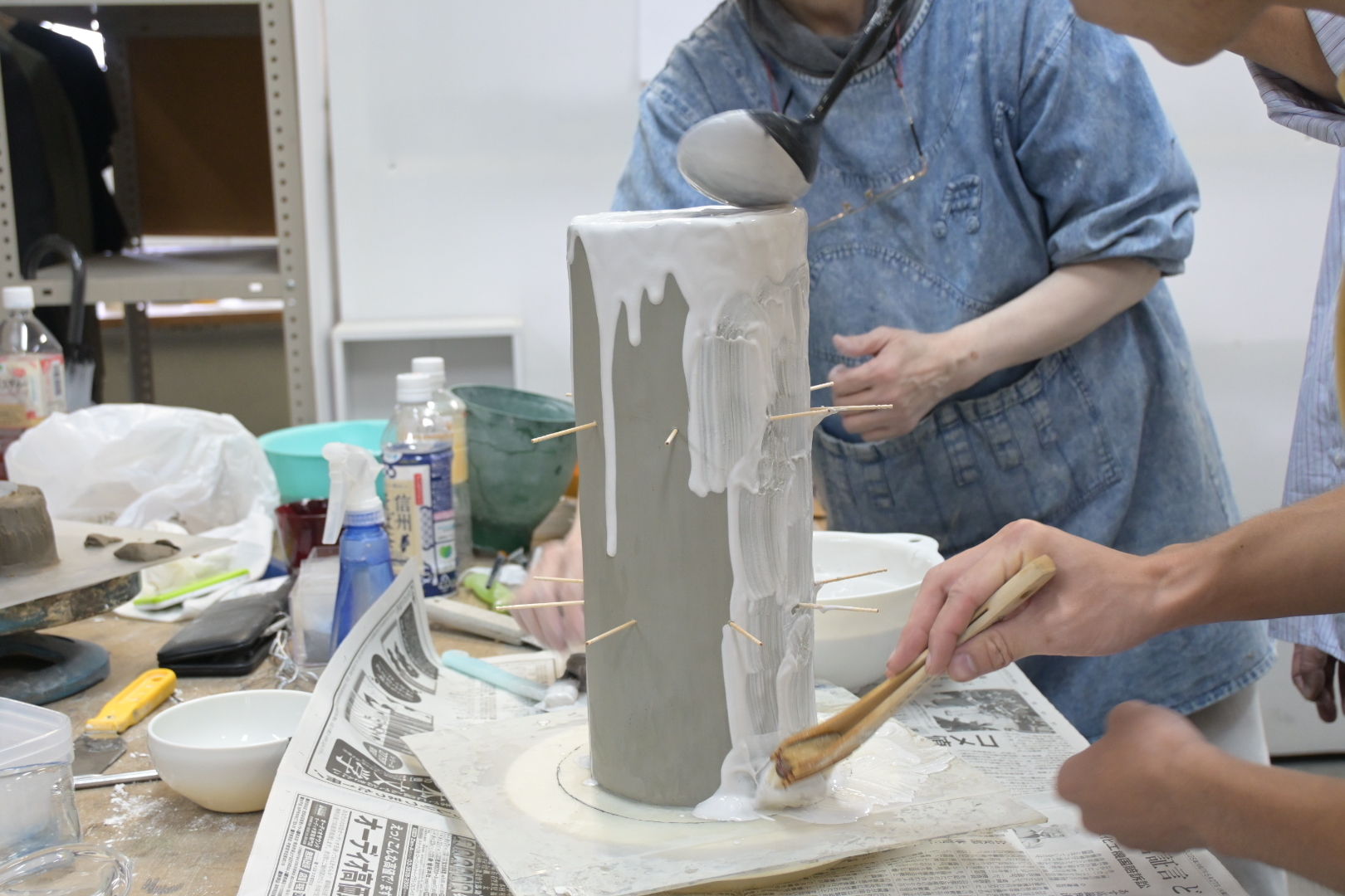 ▼同期の力を借りながら、粘土の周りに石膏を塗る