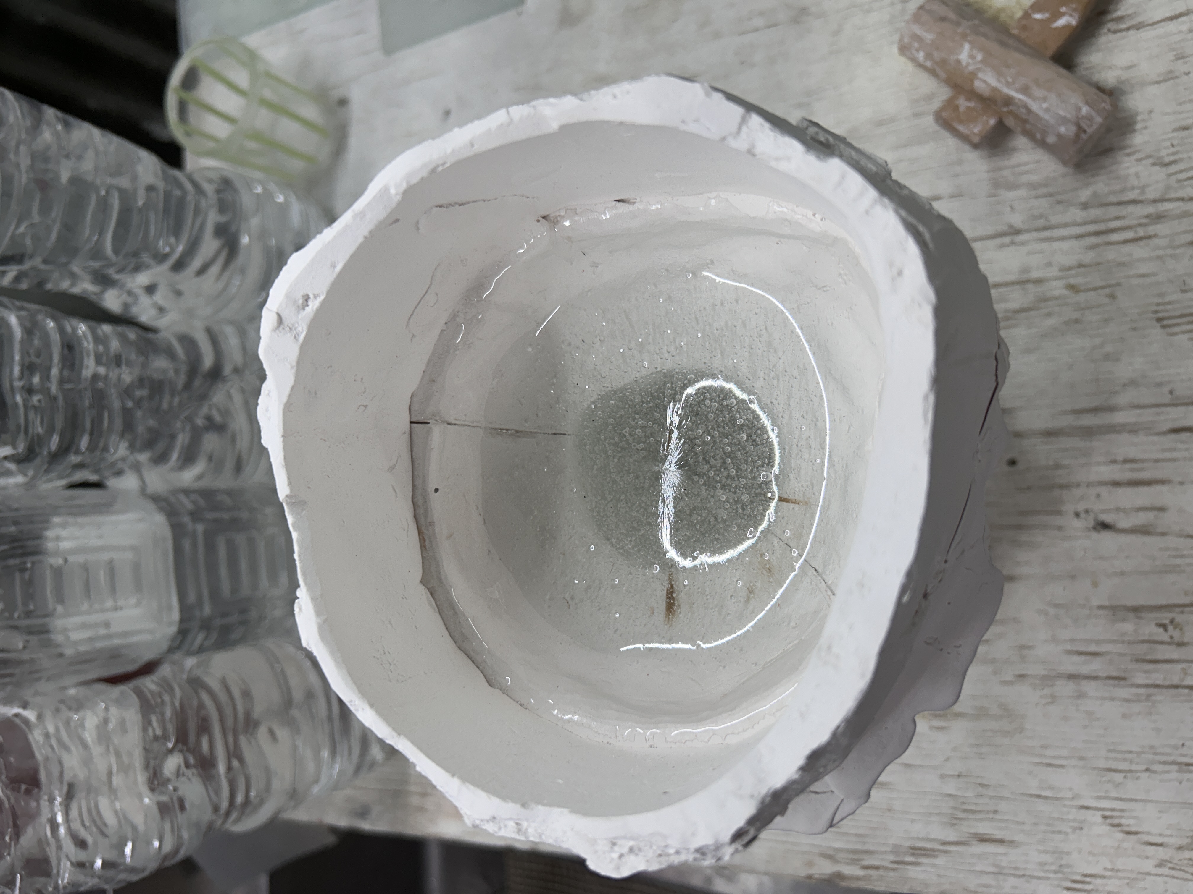 そして、型から粘土を取り出し終わったら、割った石膏を貼り合わせて、ガラスの粒を入れます。
