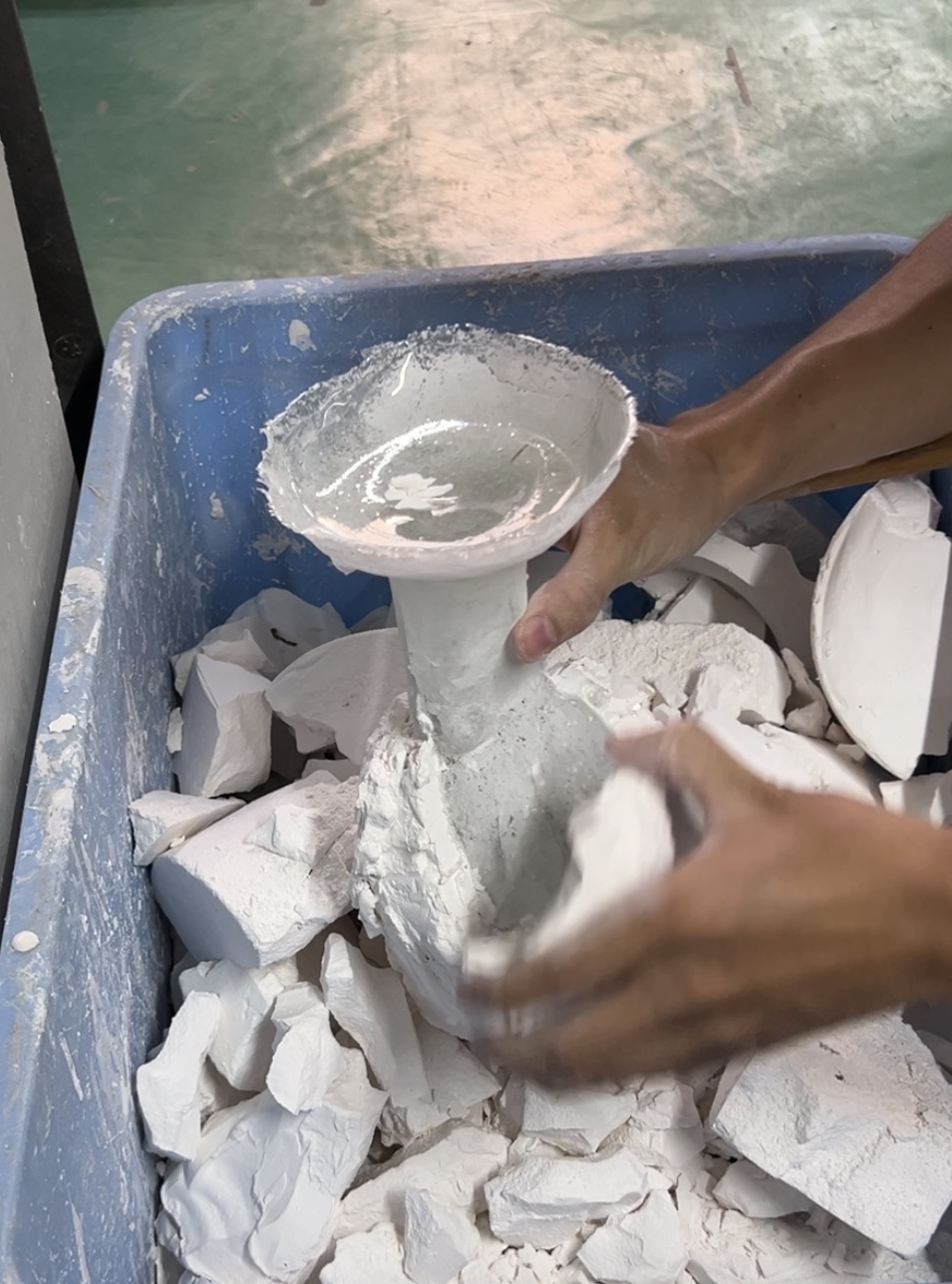 石膏は一度焼くと、クッキーのようなもので、また溶かしなおして使うということはできませんので、割ってしまいます。
