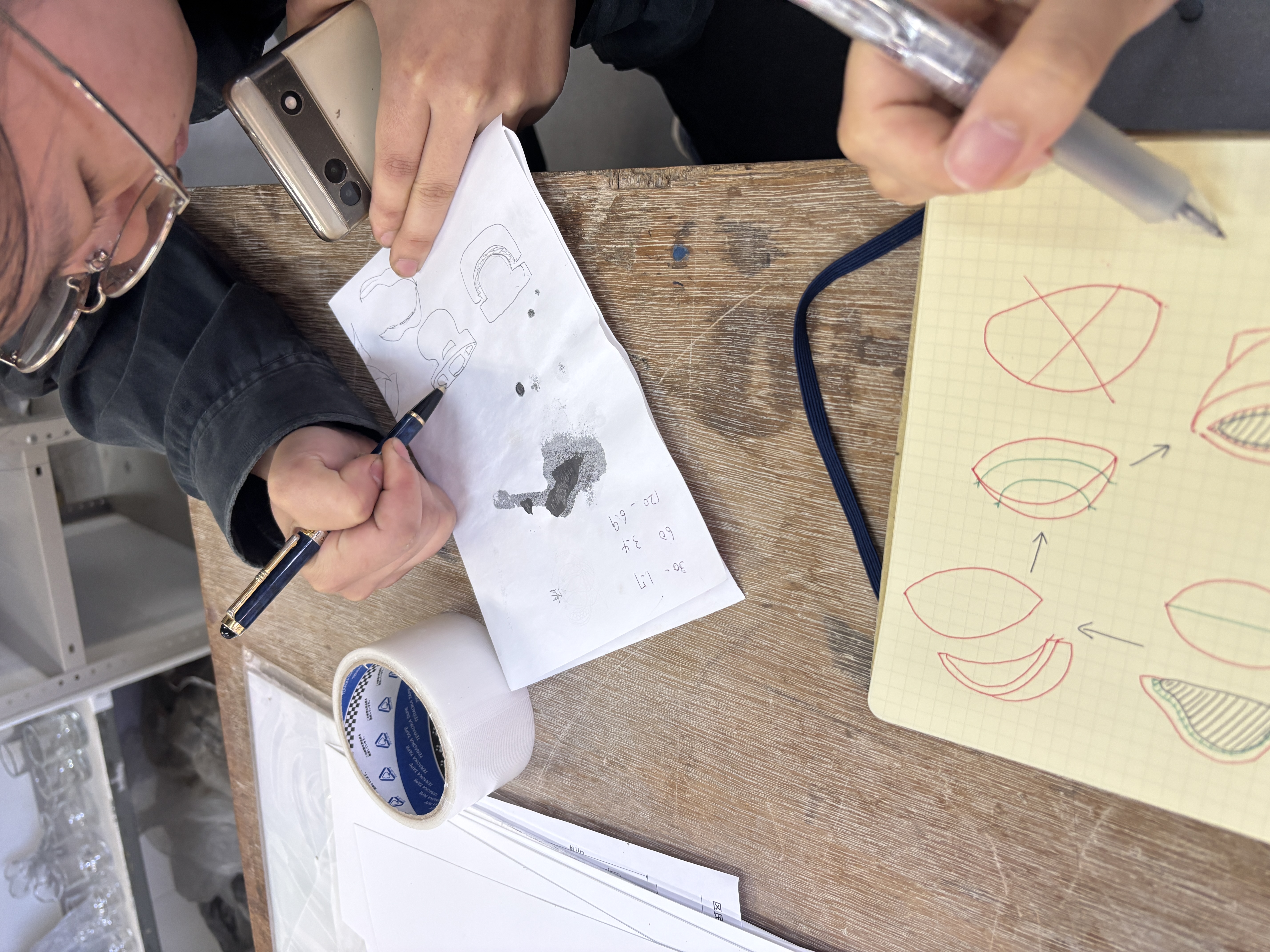 ▼できたガラスと手(原案)を見比べて。ここに来るまで2週間!