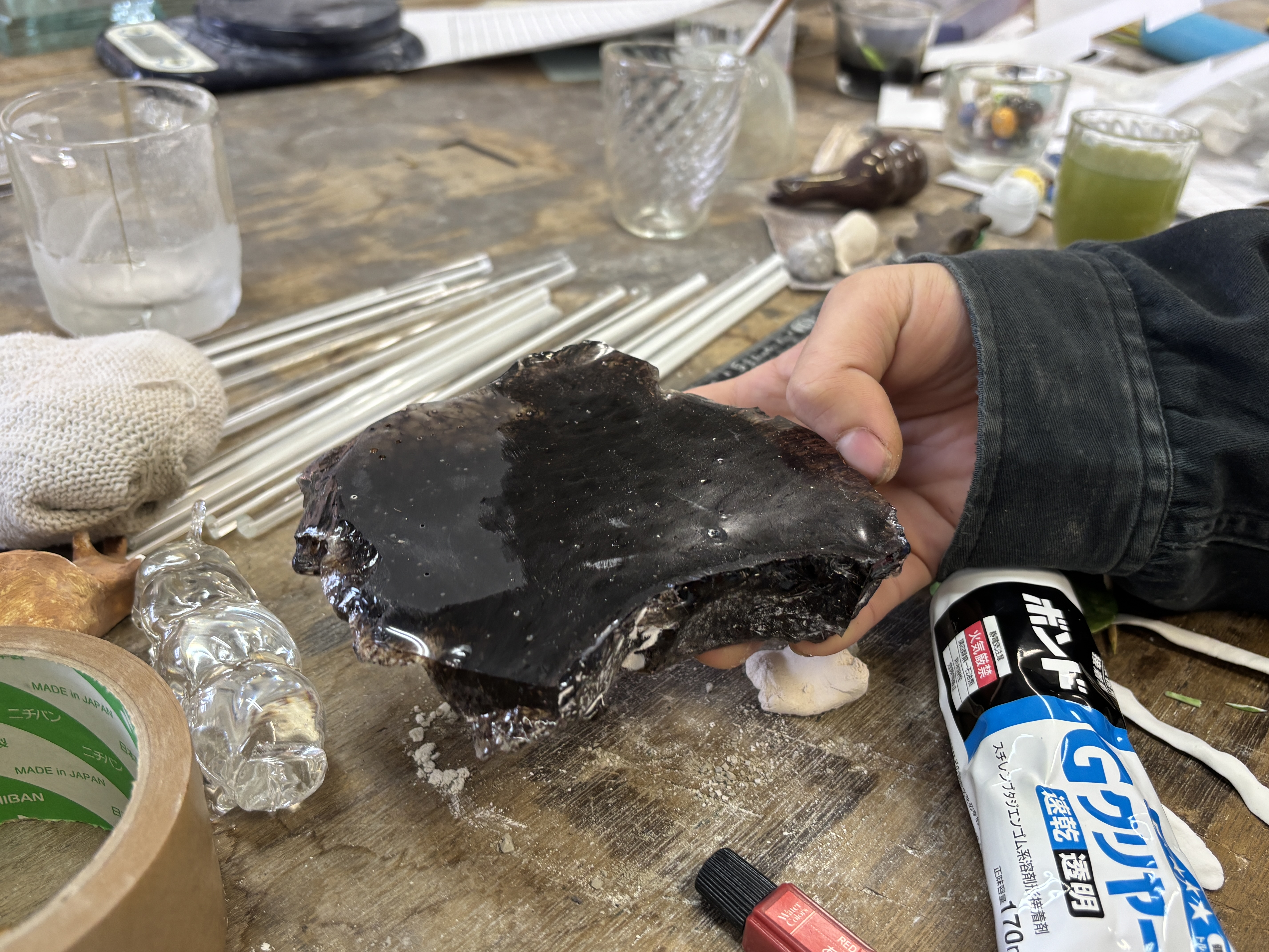 さて、清水さんの卒業制作は、この何倍ものサイズがあり、しかも中は空洞です。1年生の時の授業で、ある程度パート・ド・ヴェールの基礎技術は身につけている清水さんですが、大人の歩幅ほどある大きな作品を作るのは初めてです。誰もが「難しそう!!」と叫ぶハイレベルな型作りに、果敢に取り組みました。